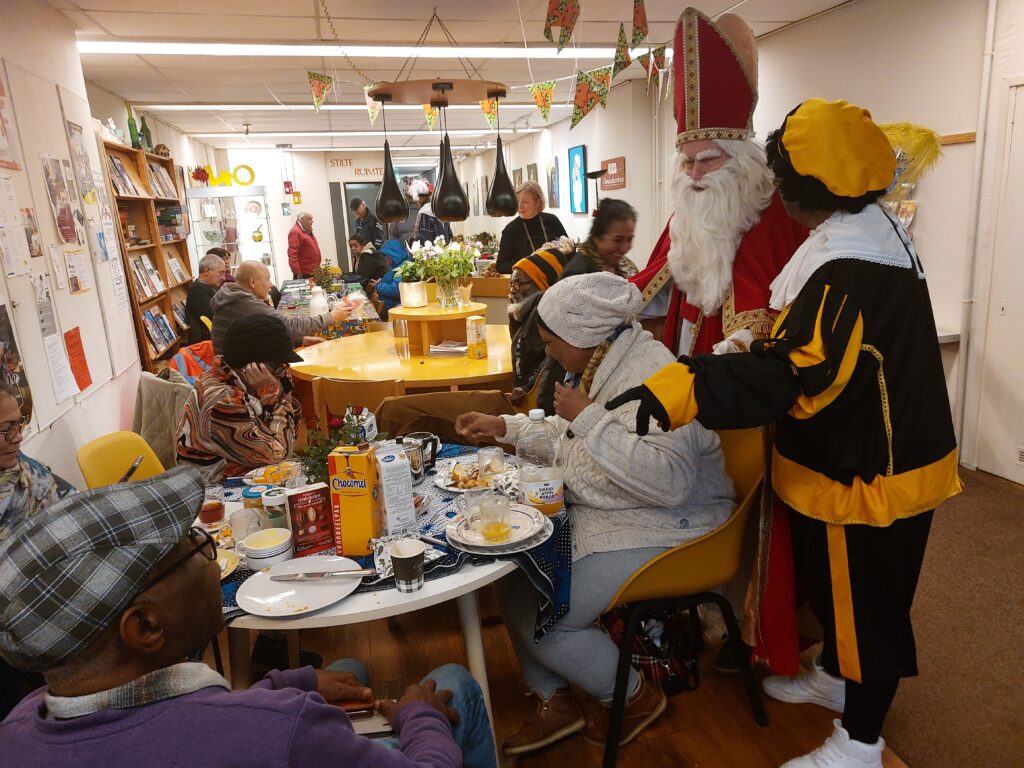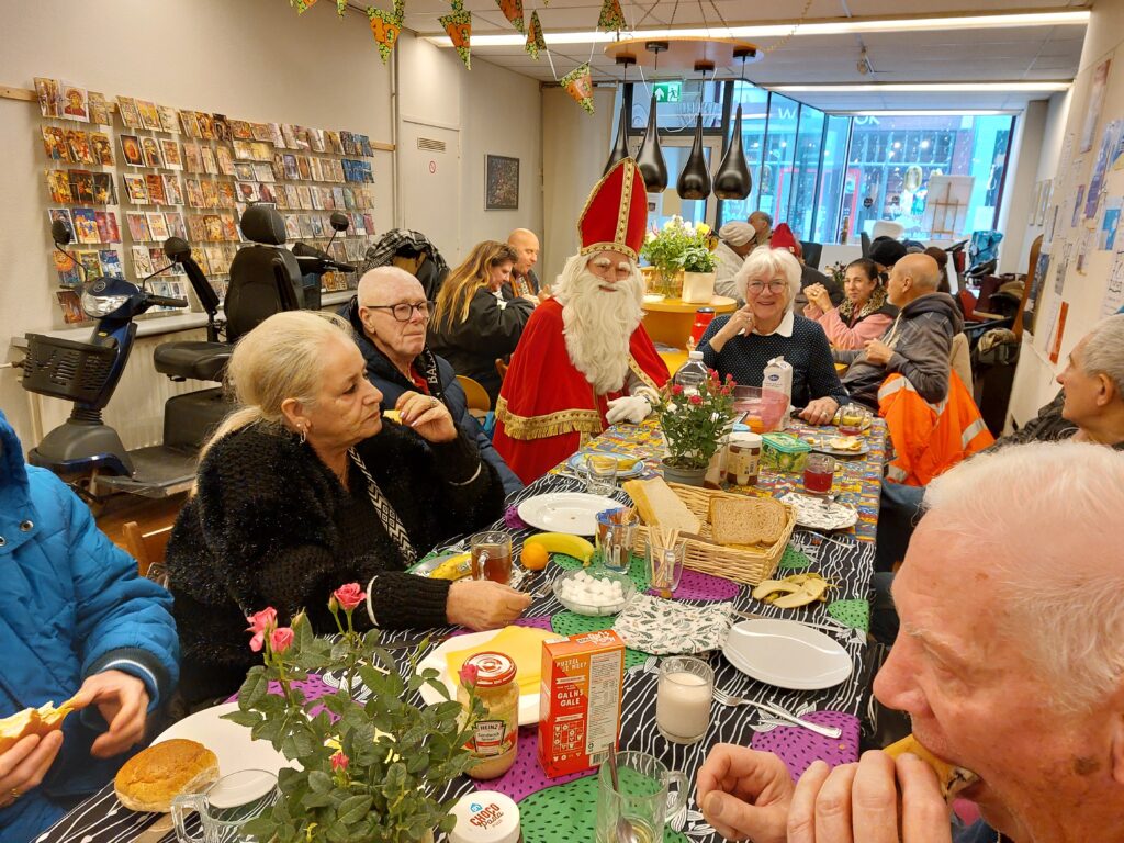 Iedere eerste maandag van de maand lunchen we samen in het Aandachtscentrum. Samen eten schept verbinding! Sommigen hadden er stiekem op gehoopt dat Sinterklaas met zijn Pieten net als vorig jaar weer zou komen, maar tot het laatste moment bleef het onzeker. Gelukkig vond de Goedheiligman tijd voor ons en toen hij en zijn Pieten werkelijk binnenstapten, werden ze luidkeels toegezongen. En iedereen wilde met hen op de foto!