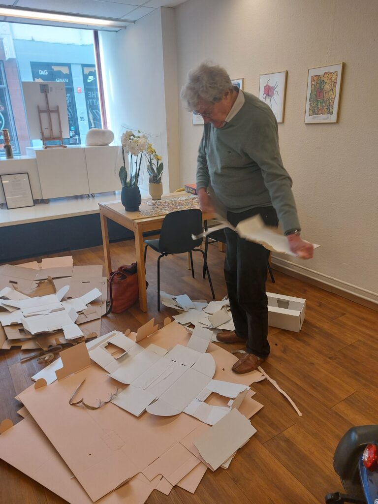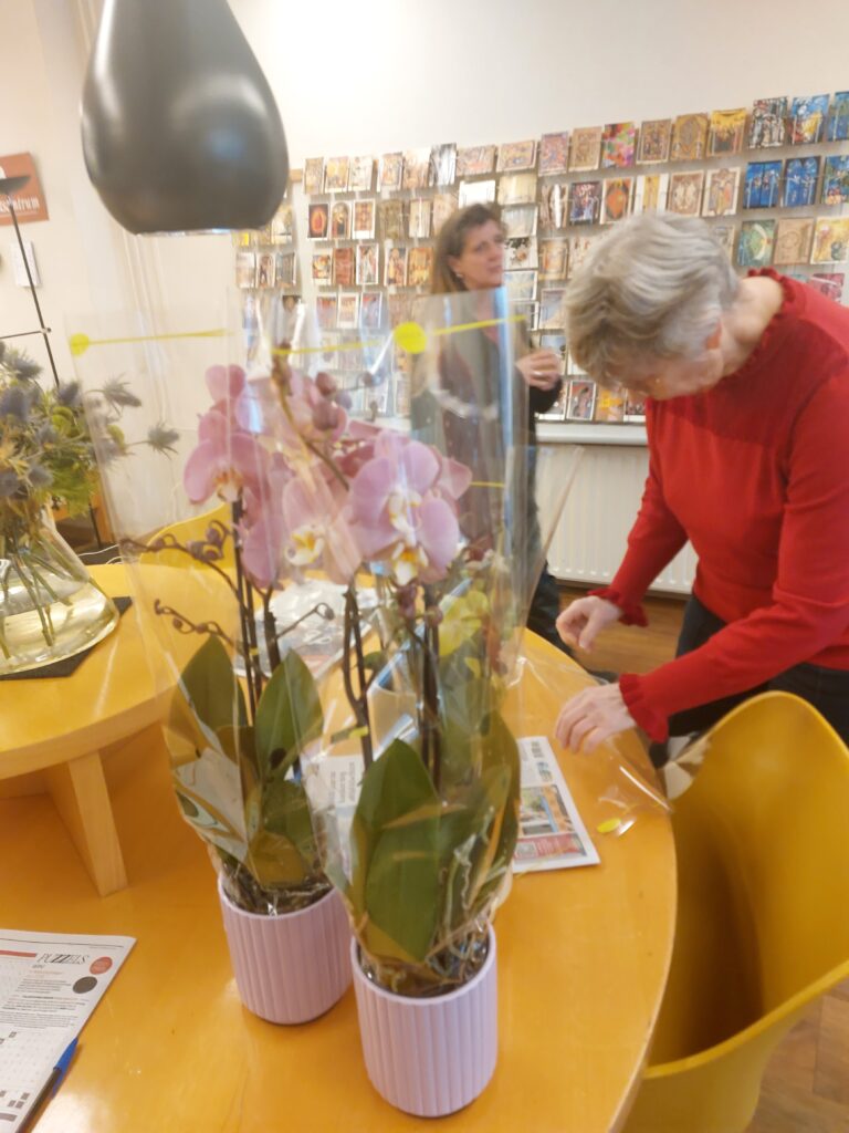 Een van onze vrijwilligers heeft een vriend die in bloemen en planten handelt en zo nu en dan krijgen we wat van hem. Vorige week werden er opeens een tiental grote dozen bezorgd. In iedere doos bleek een orchidee verpakt te zijn: roze, gele en witte in een bijpassende pot. Wat een feest. Het kleinmaken van de kartonnen dozen was nog een hele klus!