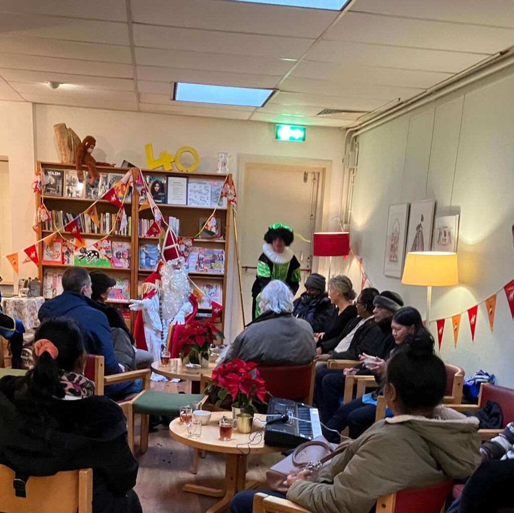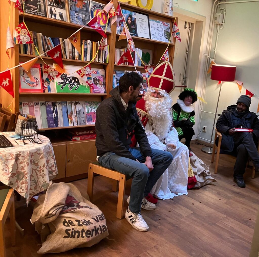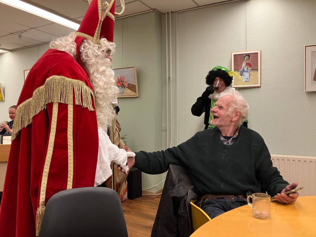 Vol verwachting klopte ons hart 5 december. Zou hij echt komen? Ja, hoor. Sint had zelfs 2 Pieten bij zich. Ze strooiden pepernoten en deelden chocoladeletters uit. Het werd een vrolijke middag. Met iedereen maakte Sint een praatje en tot vreugde van velen draaide Sint zelf de speciale Sinterklaasbingo.
