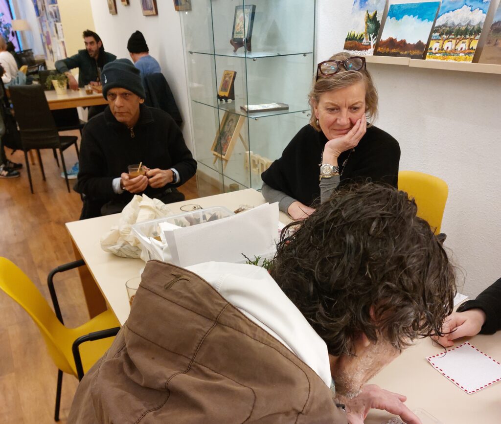 Vrijdag 10 januari zijn we een nieuwe activiteit gestart: knutselen met naald en draad. Met Esther als gangmaker zijn bezoekers en vrijwilligers begonnen een slinger, bestaande uit kleine lapjes, te borduren en te versieren met kraaltjes. Sommigen maakten een armbandjes met een naam erop en gaven die aan elkaar.